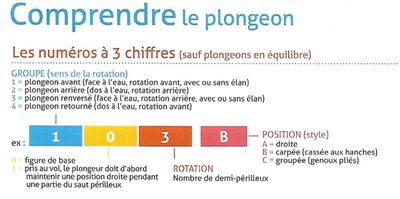 Ainsi, le plongeon 6162 C se traduirait comme suit : équilibre et triple saut périlleux avant avec 1 vrille en position groupée.